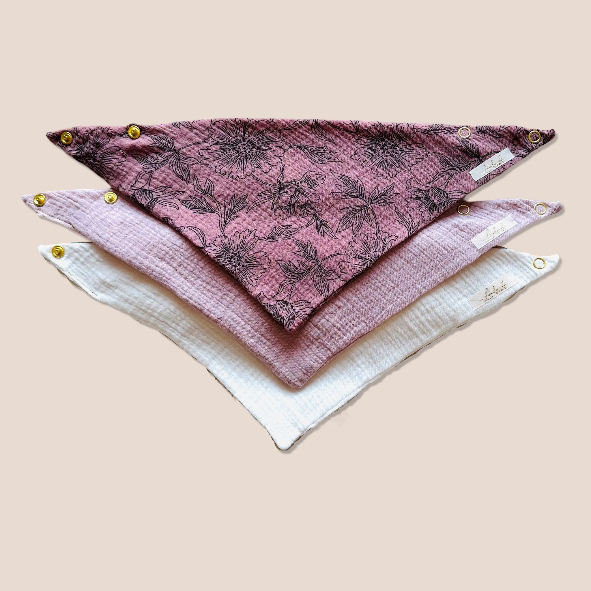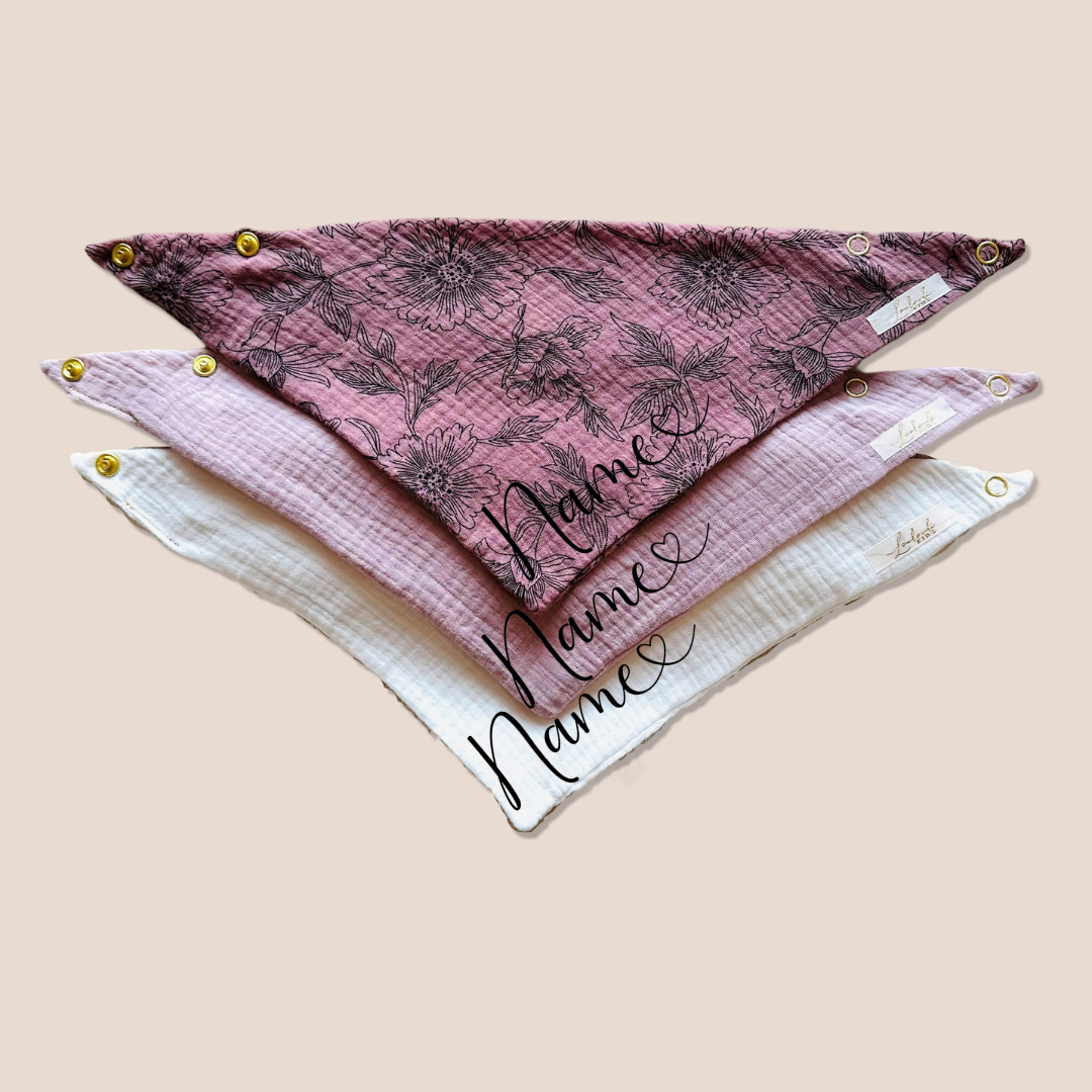 Set 3 Stück personalisierbar Musselin Baby und Kleinkind Halstücher Dreieckstücher Spucktücher Bio Baumwolle Lätzchen Gaze Geschenk Kinder Musselintuch Musselintücher Dreieckstuch Blumen Blüten Mädchen Rosa Beige Halstuch Louloudi KIDS