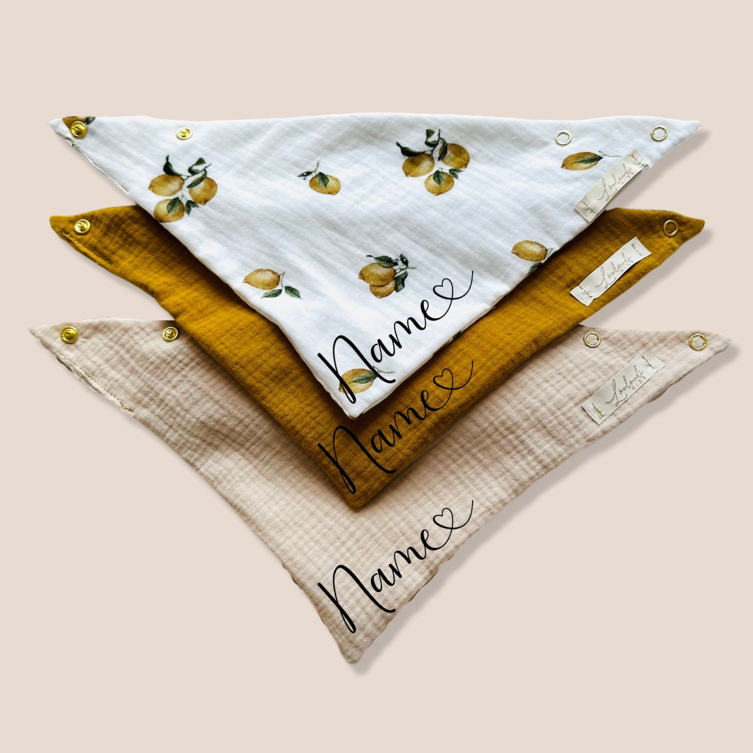 Set 3 Stück personalisierbar Musselin Baby und Kleinkind Halstücher Dreieckstücher Spucktücher Bio Baumwolle Lätzchen Gaze Geschenk Kinder Musselintuch Musselintücher Dreieckstuch Zitronen Beige Halstuch Louloudi KIDS