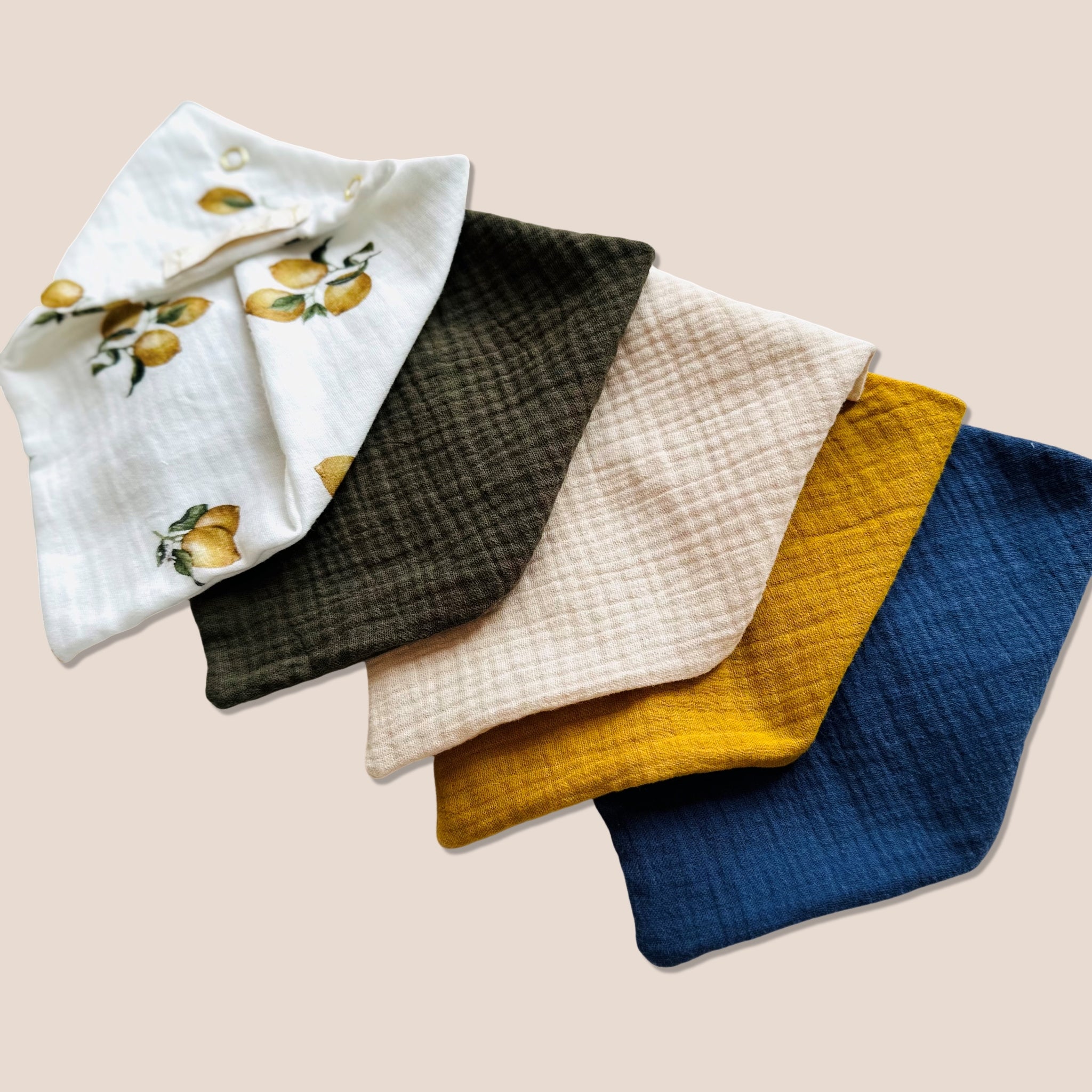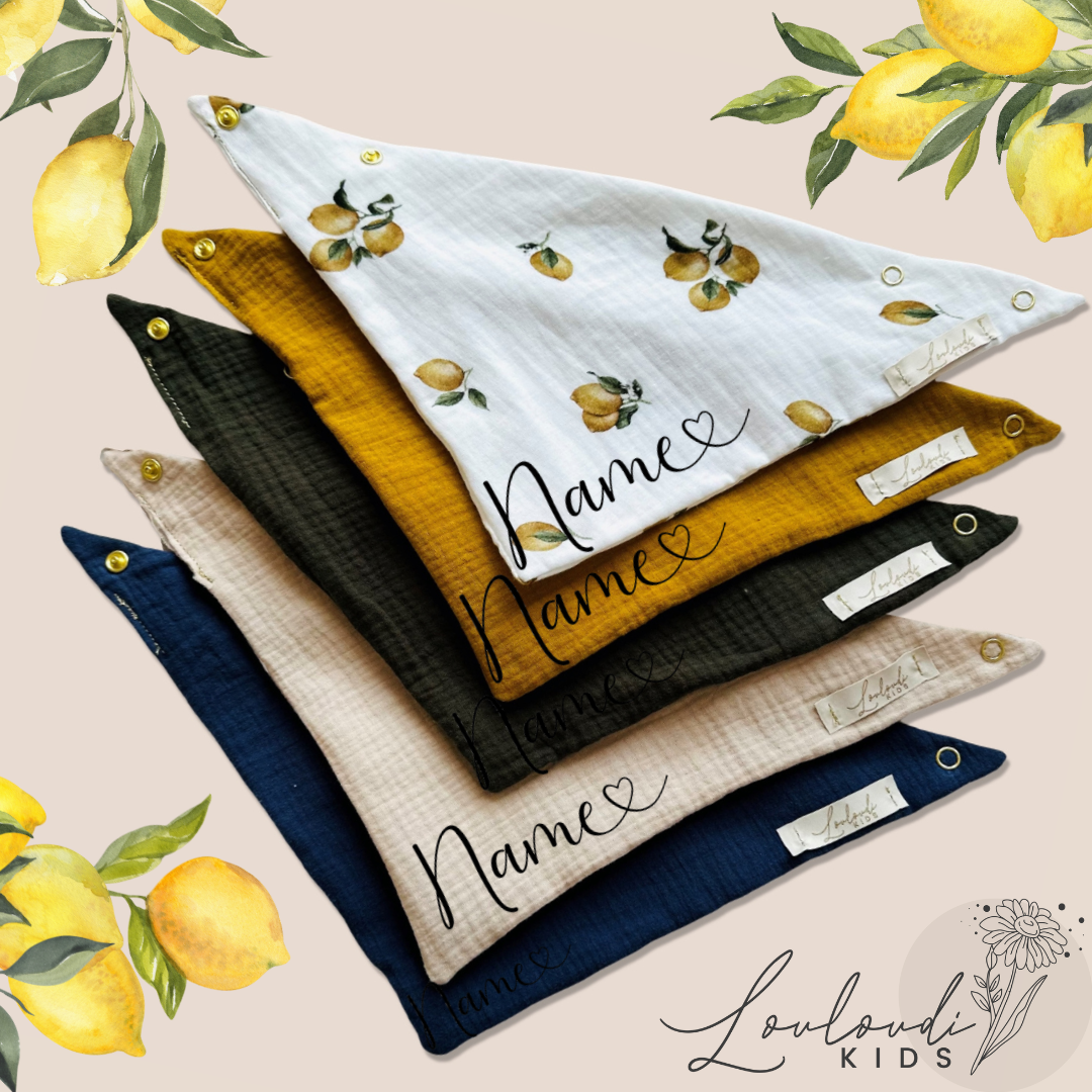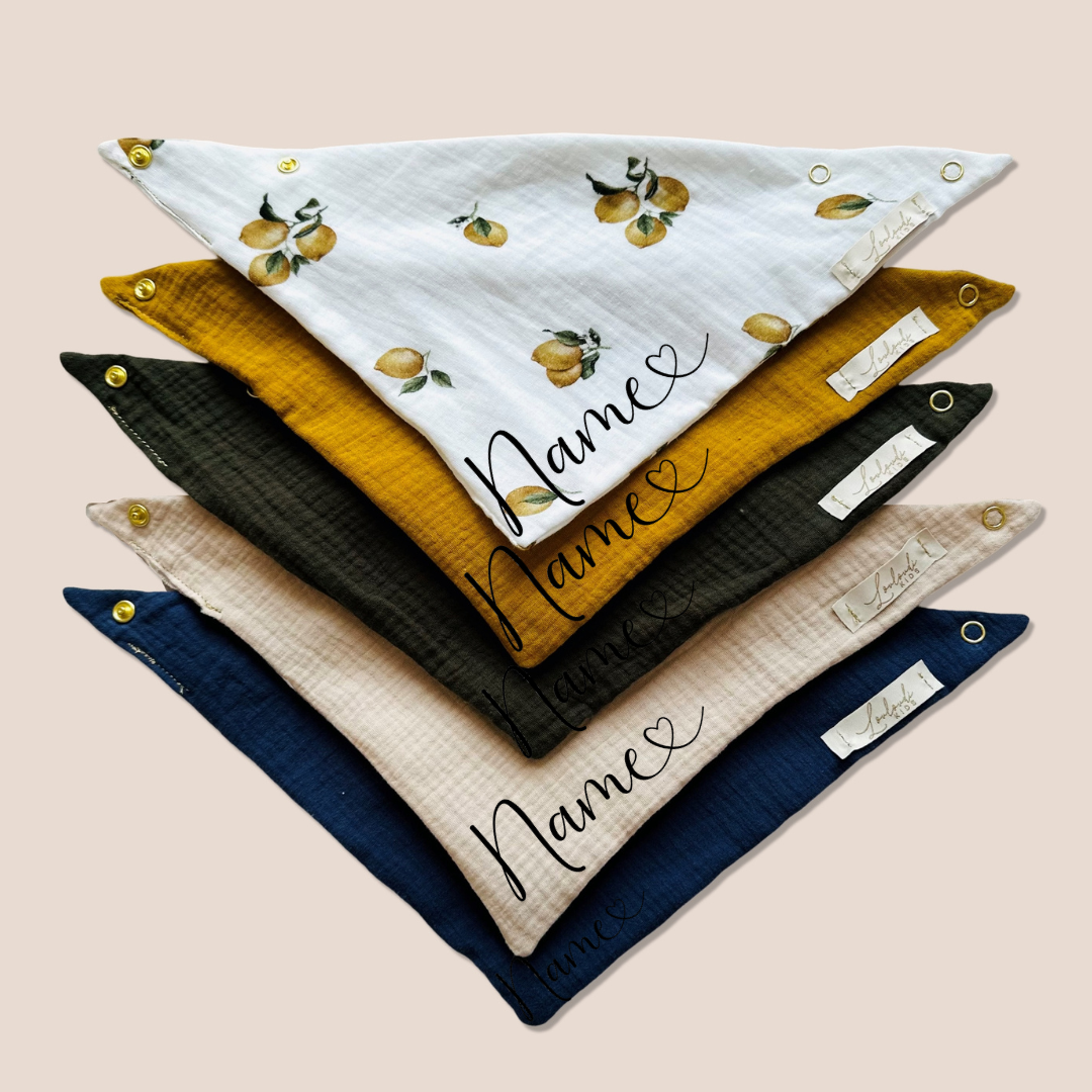 Entdecke unser Set aus 5 Stück Musselin Dreieckstüchern von Louloudi Kids. Unsere Halstücher sind aus Bio-Baumwolle, können personalisiert werden und bieten Ihrem einen natürlichen und bequemen Schutz. Perfekt für Babys und als Geschenk! Dank des atmungsaktiven und weichen Musselin-Materials sind sie auch ideal für empfindliche Kinderhaut. Ein Muss für alle Eltern!