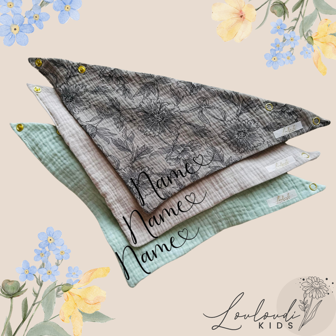 Entdecke unser Set aus 3 Stück Musselin Dreieckstüchern von Louloudi Kids. Unsere Halstücher sind aus Bio-Baumwolle, können personalisiert werden und bieten Ihrem einen natürlichen und bequemen Schutz. Perfekt für Babys und als Geschenk! Dank des atmungsaktiven und weichen Musselin-Materials sind sie auch ideal für empfindliche Kinderhaut. Ein Muss für alle Eltern!