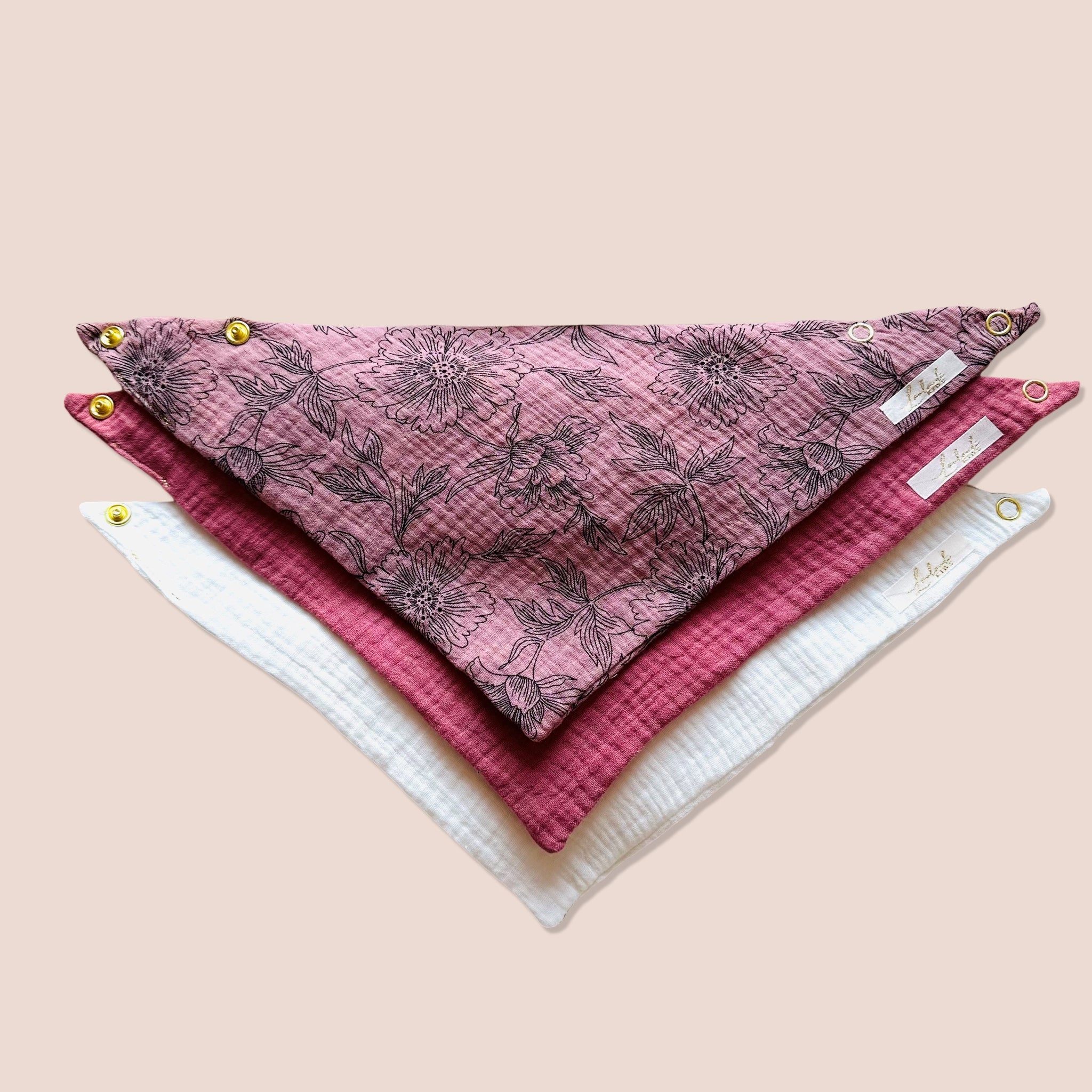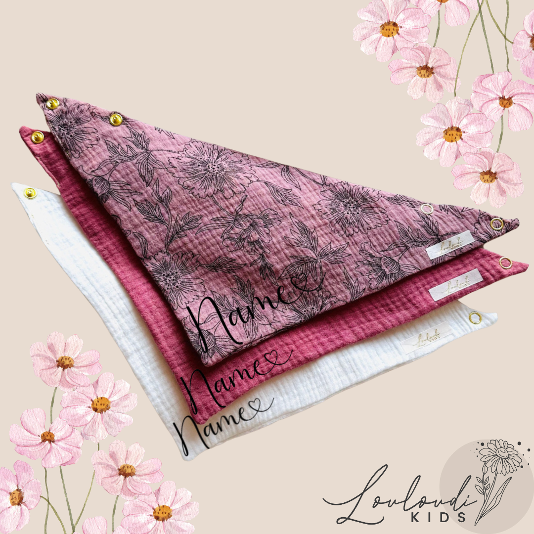 Set 3 Stück personalisierbar Musselin Baby und Kleinkind Halstücher Dreieckstücher Spucktücher Bio Baumwolle Lätzchen Gaze Geschenk Kinder Musselintuch Musselintücher Dreieckstuch Blumen Blüten Mädchen Rosa Beige Halstuch Louloudi KIDS