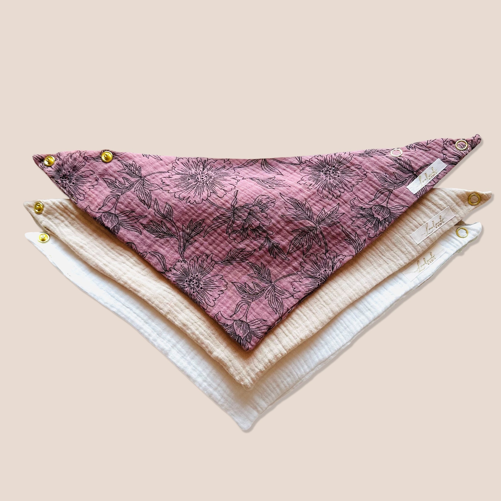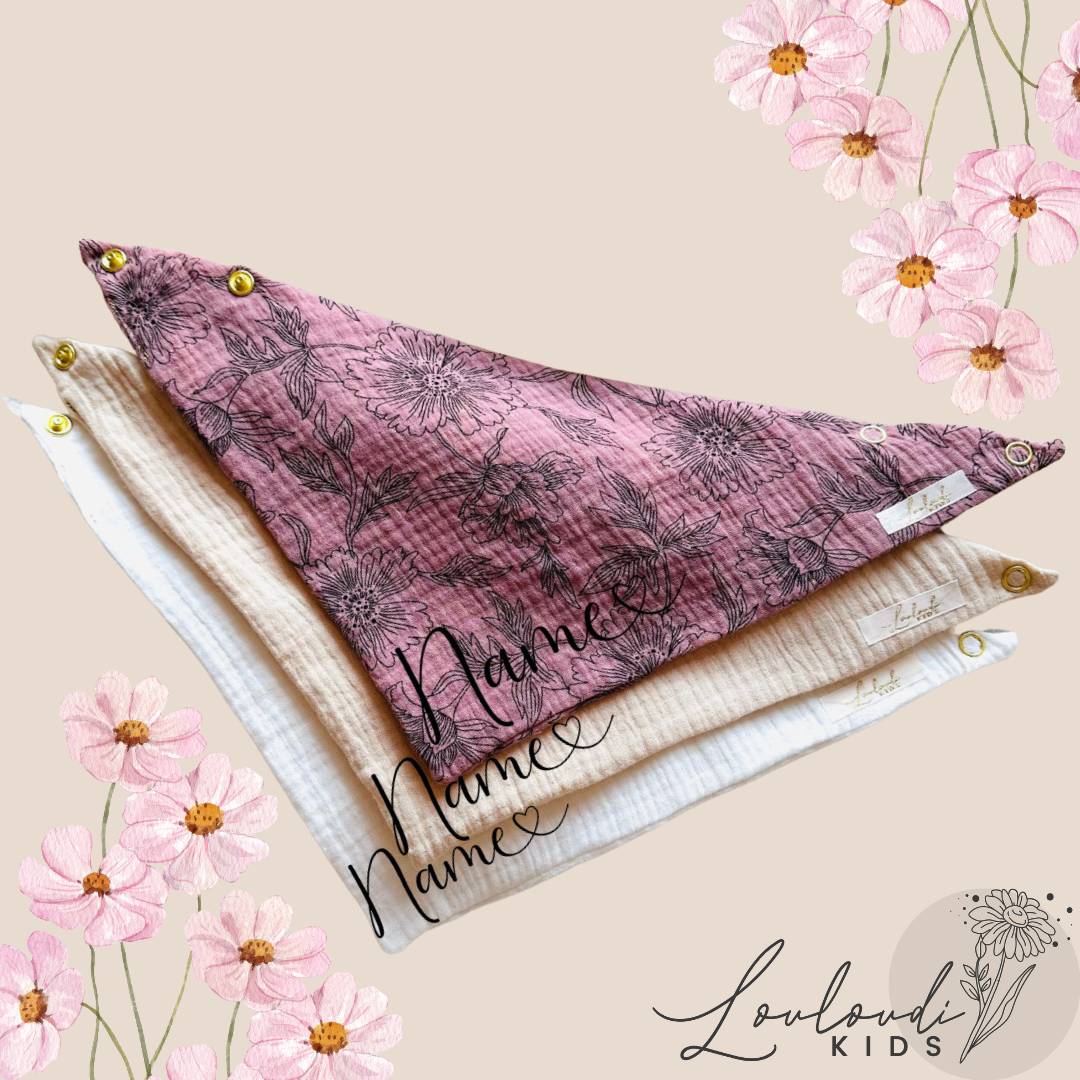 Set 3 Stück personalisierbar Musselin Baby und Kleinkind Halstücher Dreieckstücher Spucktücher Bio Baumwolle Lätzchen Gaze Geschenk Kinder Musselintuch Musselintücher Dreieckstuch Blumen Blüten Mädchen Rosa Beige Halstuch Louloudi KIDS