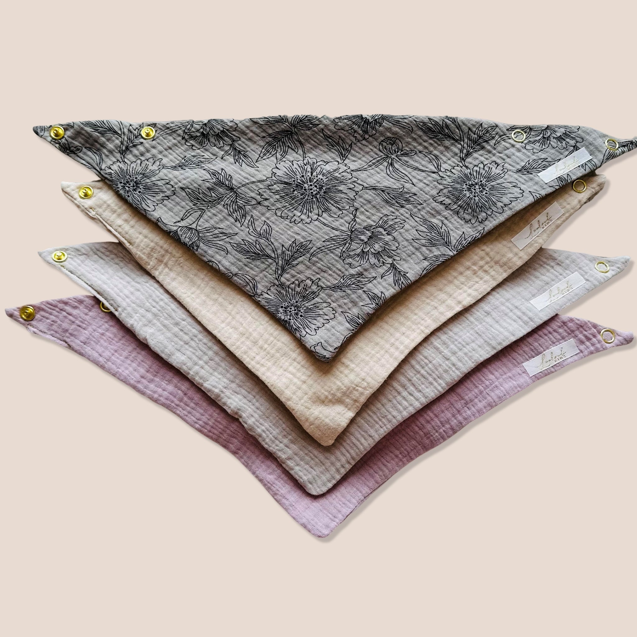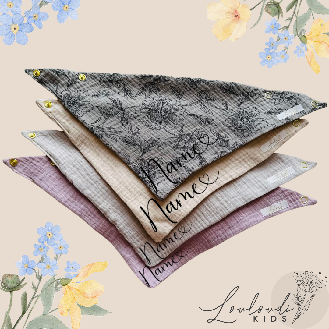 Entdecke unser Set aus 4 Stück Musselin Dreieckstüchern von Louloudi Kids. Unsere Halstücher sind aus Bio-Baumwolle, können personalisiert werden und bieten Ihrem einen natürlichen und bequemen Schutz. Perfekt für Babys und als Geschenk! Dank des atmungsaktiven und weichen Musselin-Materials sind sie auch ideal für empfindliche Kinderhaut. Ein Muss für alle Eltern!
